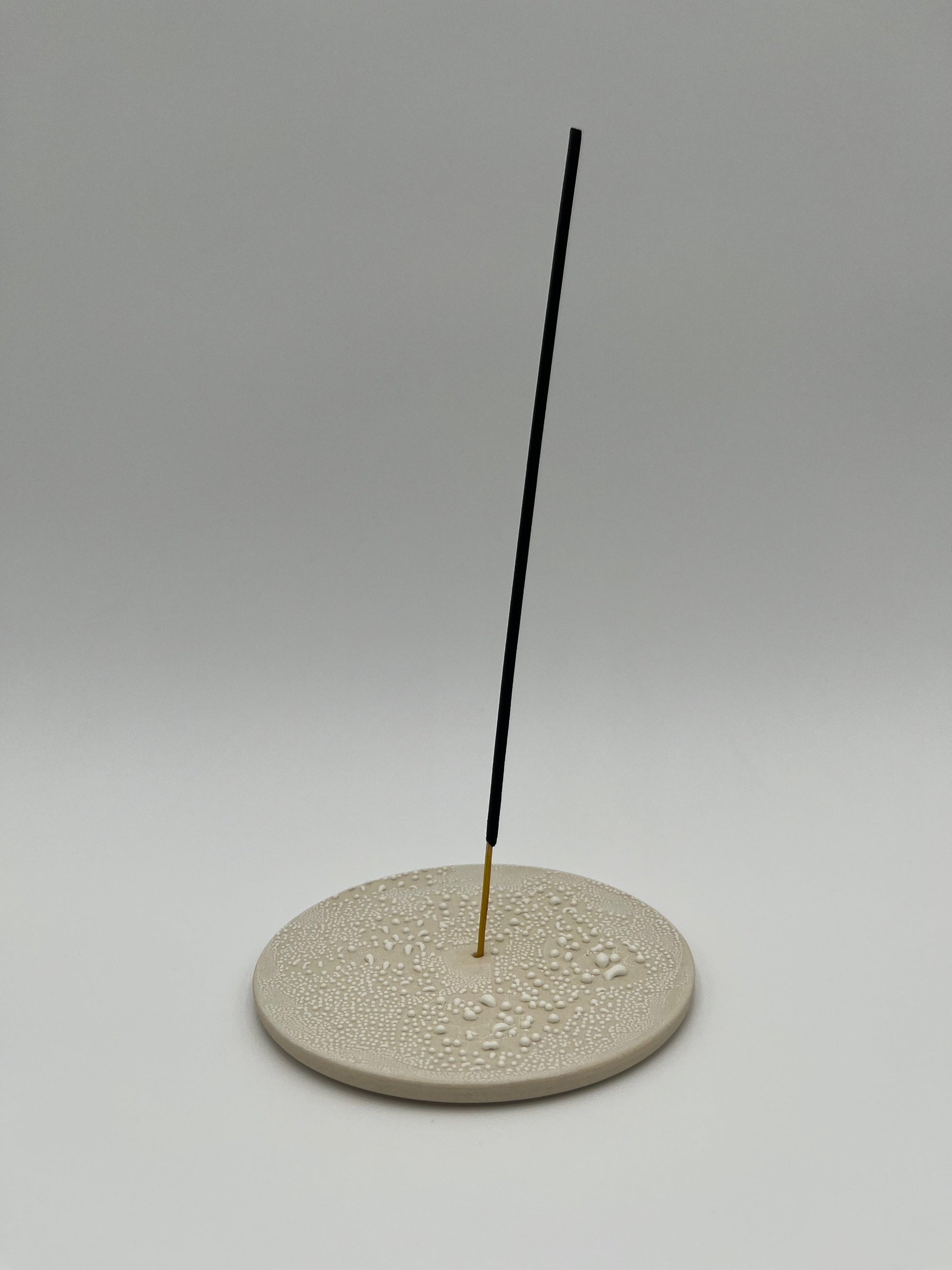 Handmade stoneware clay body in white dew color, stained with textured drip accents. No two are identical.
