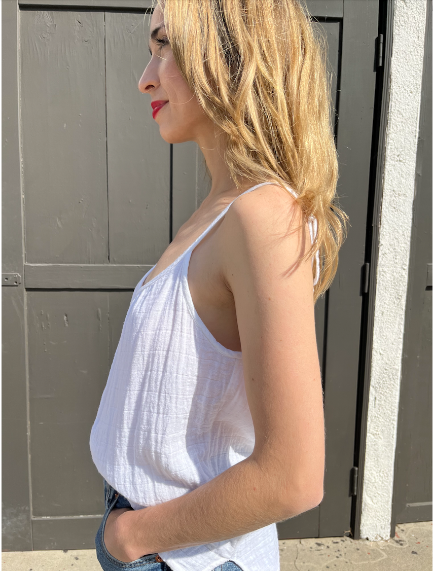 Based on the founder's favorite white tank in cotton double gauze cotton fabric. Loose fitting and comfortable with slight sheerness. Bra strap-style adjusters in back.
