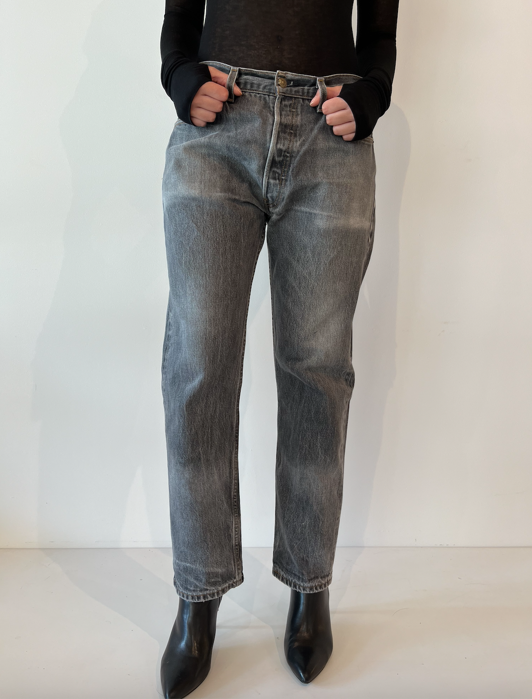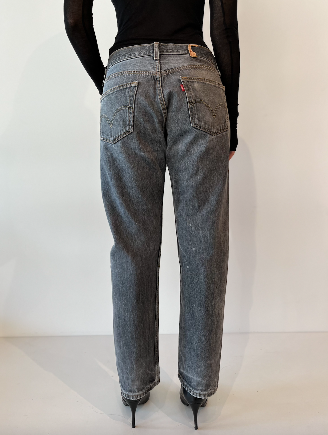 One of a kind authentic vintage 501 washed-out, black button-fly Levis. This waist measures 32” around the top interior and hangs low on the hip for women's size 25-26 jeans. If you wear size 26-27 jean it will hang right below the navel with a bit of slouch. From top button to crotch measures 11.5”. Has light and dark streaks and the denim is soft and worn in. The back of the right leg has some fair white dot markings. Inseam is 28.5". Overall authentic vintage markings in accordance with vintage Levis. Perfect for those that wear women’s jean size 26-28. Contact us with any fit questions. Vintage is final sale.